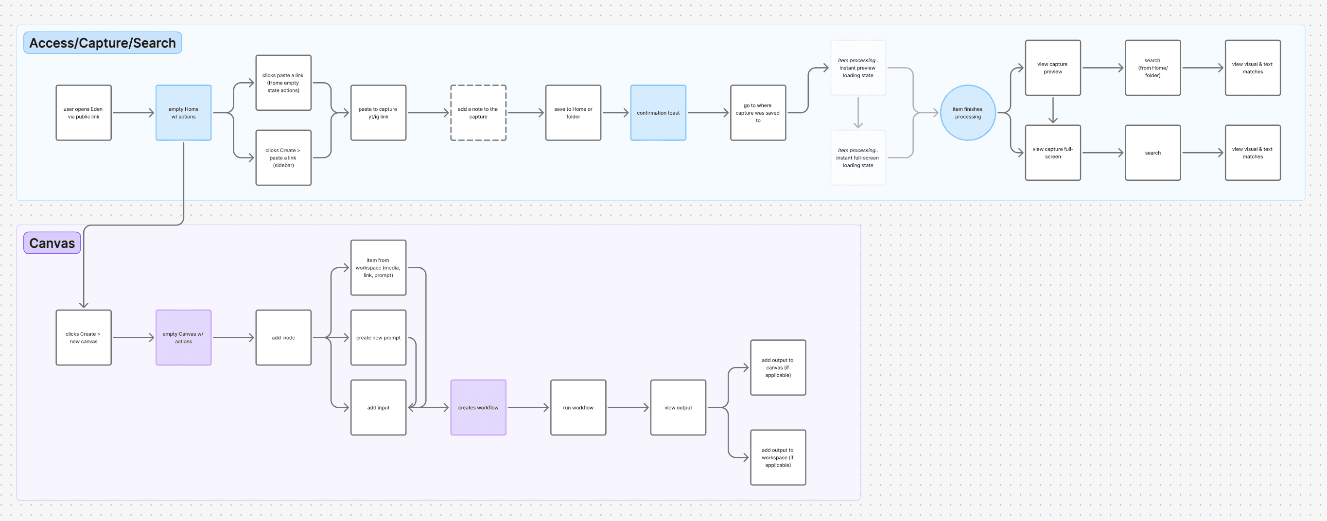 Being an early-stage startup, our team had many ideas, and limited time to design and ship out features. Using FigJam, I mapped our first-touch experience flow and worked with our PM to narrow it down to a basic flow that supported core user workflows, like Search, Capture and Canvas for the MVP.